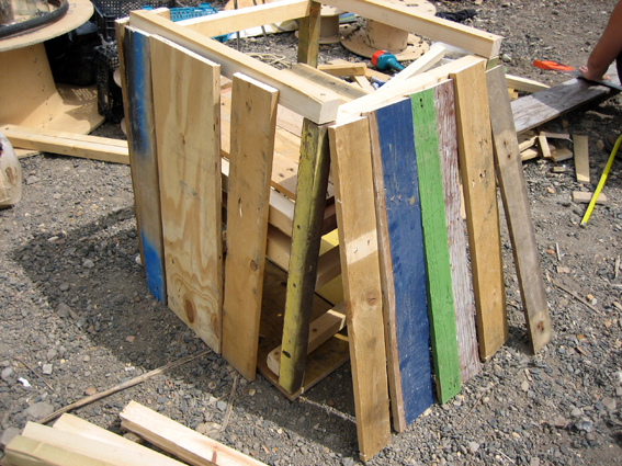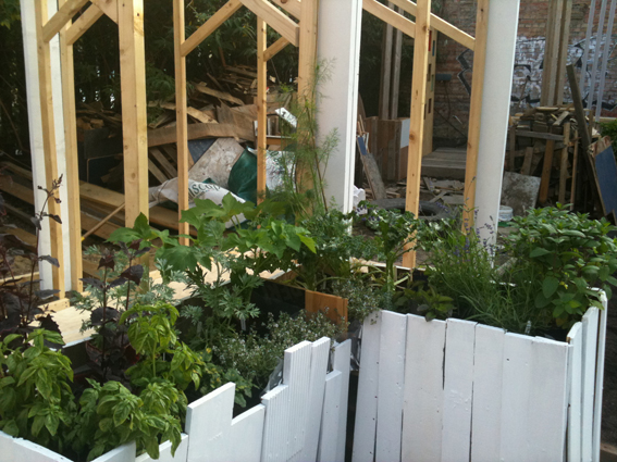 I first volunteered in May and spent a really great morning working with another volunteer Nell, building a planter. Wood was being moved around the site into distinctive piles: for planters, a stage, treatment room, incubator, shelves for plants going up for adoption, poison cabinet, cafe seating, and for the firepit.