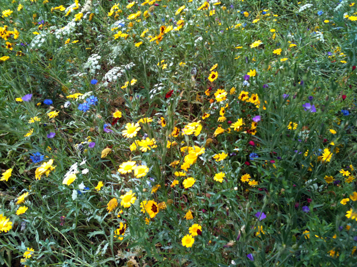 Cycling around, over and under Twickenham Bridge during the summer, I noticed the long sweeping barren patch of sand in the Old Deer Park bordering the A316 and thought it was a new ultra long long jump. There is a continual river of traffic crossing the brown Thames at right angles over Twickenham Bridge, with Richmond Lock on one side and the South West train bridge the other. At twilight, the lock lights are very beguiling to look at reflected in the Thames. Over the summer, the sand sprouted, and by September, a beautiful swathe of meadow flowers ran right along the side of the park, cushioning the people on foot and bike from the traffic. I really appreciated it and I saw many people walking beside it, around it, along it.