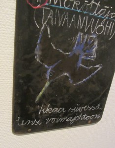 The collection of hospital beds for the birds seems to have been assembled together as a ‘book’, or in relation to a series of stories. Here is a section from the information available at the Art Museum run through ‘translate’, a comment about the work from the artist Katri Suonion. Some of the translation clearly isn’t working, but I like that as it reflects the tenderness of the work, and lack of language to express the complexity of it all.