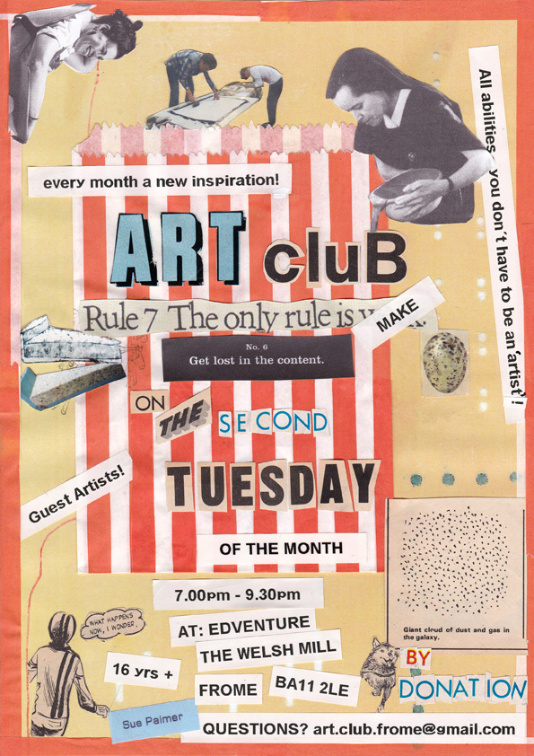 Joff and Sue have been pals for many years, and both are completely keen on art. Joff introduced Sue to the artist nun Sister Corita Kent way back, and Corita became one of the inspirations behind starting Art Club – one of her rules being ‘everything is an experiment’. Moving back to Frome, Somerset in 2016, Sue wanted to start an experimental art making space as a way of overcoming her fear of mark making – Sue works mainly as a performance maker but visual art is so compelling. Art Club would be open to artists and non-artists just as a place to experiment and make without having to have any outcome.