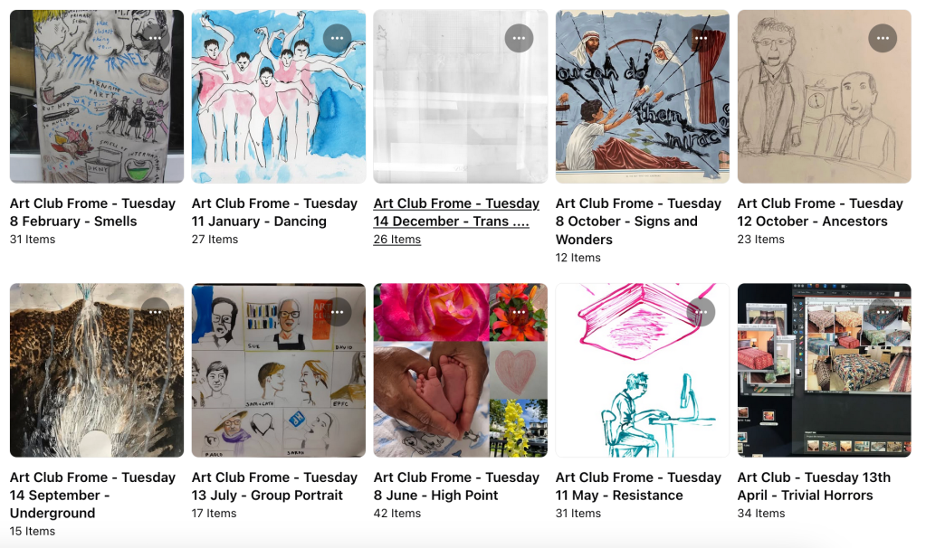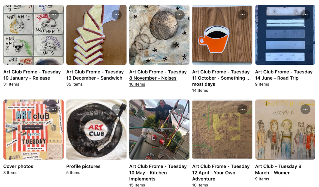 Art Club is convened by Sue Palmer with artist Joff Winterhart and has been running most months since May 2017. Art Club used to run in person at the Edventure Hub in the Welshmill in Frome, but now it is online with the odd live session.