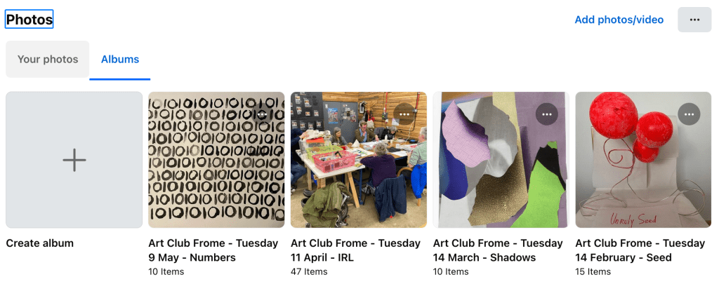 Art Club happens on the second Tuesday of the month through the year. It happens on Zoom, from 7pm to 9pm UK time (that’s 11am to 1pm Canada NW Territories for those joining from there!). A theme / prompt is given at the start, then everyone goes off Zoom to make, and then we come back on to the zoom to show / share (only if you want) process and things made.