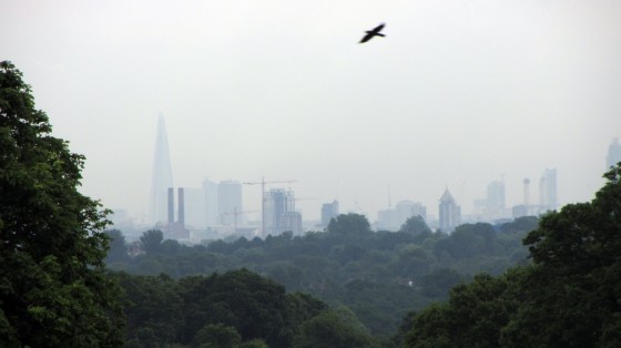 The view from Sawyers Hill in Richmond Park, through to central London. The Shard, the cranes in the thundery morning … More